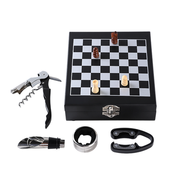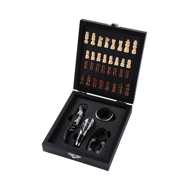 Unique chess set presented in an MDF storage box, complete with a selection of wine accessories. Combining classic gameplay with practical entertaining tools, this set makes a perfect gift for game enthusiasts and wine lovers alike.