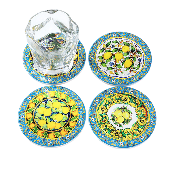 Brighten up your table setting with this set of 4 round coasters, each featuring a lively and colourful lemon design. Perfect for protecting your surfaces from heat marks, water rings, and spills, these coasters combine practicality with a fresh, Mediterranean-inspired style that brings a cheerful touch to any kitchen or dining space.