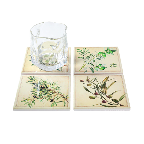 Set of 4 square coasters featuring a charming olive design. Ideal for protecting your surfaces while bringing a touch of Mediterranean style to your table setting.
