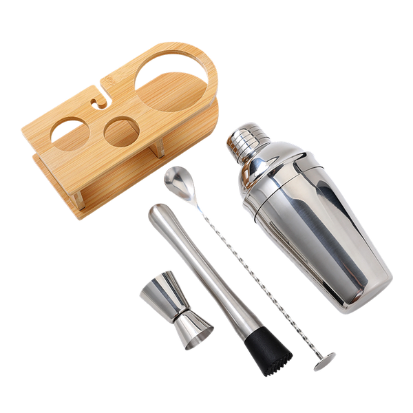 Stylish 4-piece cocktail set featuring a 550ml shaker, stirrer, muddler, and nip pourer, all neatly stored in a bamboo holder. Perfect for crafting your favourite cocktails at home, this set combines functionality with a sleek, organised display.