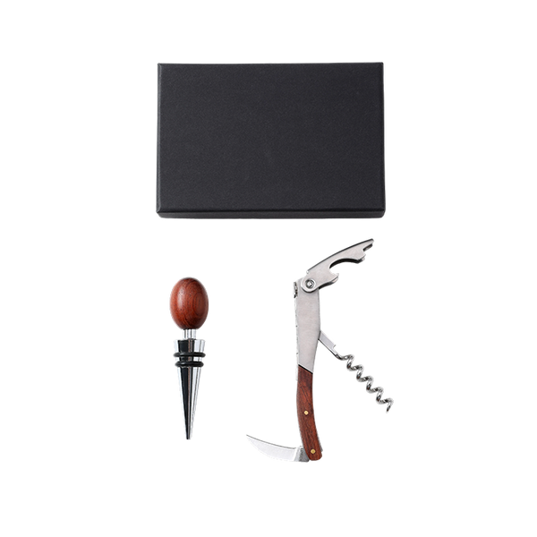 Stylish wine accessory set featuring a corkscrew and bottle stopper, presented in a sleek black box. Perfect for entertaining or gifting, it combines practicality with elegant presentation.