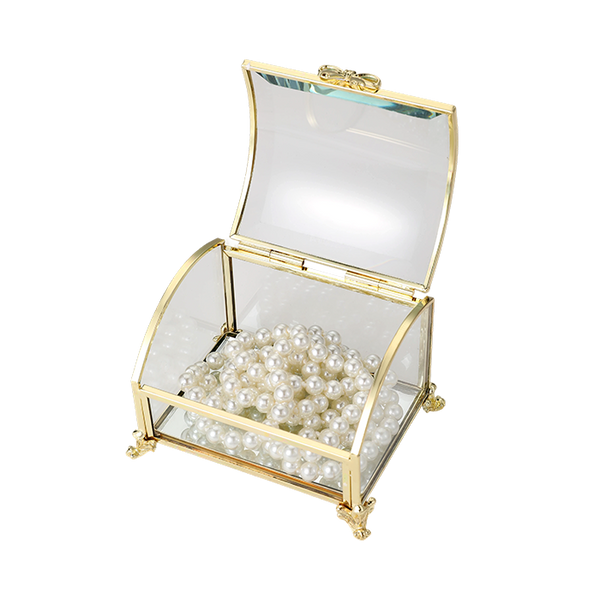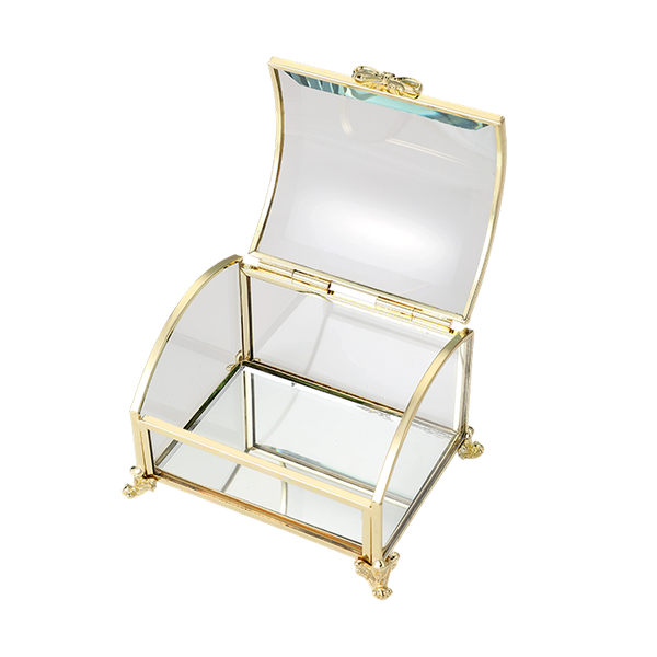 Chic gold curved jewellery box with clear glass panels and a graceful gold-tone frame. Measuring 6 x 10 x 7.7 cm, it’s perfect for storing and displaying rings, earrings, and small treasures, bringing a touch of elegance and charm to any space.