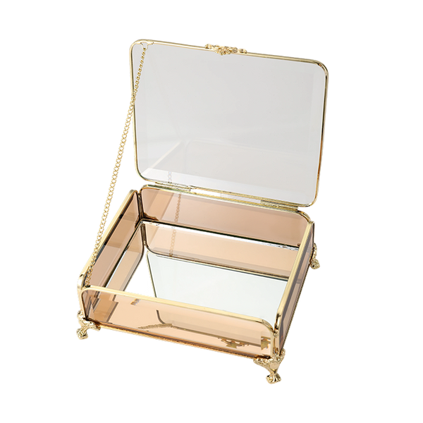 Sophisticated gold jewellery box with warm amber glass panels and a polished gold-tone frame. Measuring 6.5 x 15 x 12 cm, it’s perfect for storing and displaying rings, necklaces, and treasured keepsakes, bringing a touch of vintage elegance to any space.