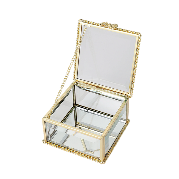 Elegant gold jewellery box with clear glass panels and a sleek gold-tone frame. Measuring 5.5 x 8.5 x 8.5 cm, it’s ideal for storing rings, earrings, and other small keepsakes, adding a stylish and timeless touch to your décor.