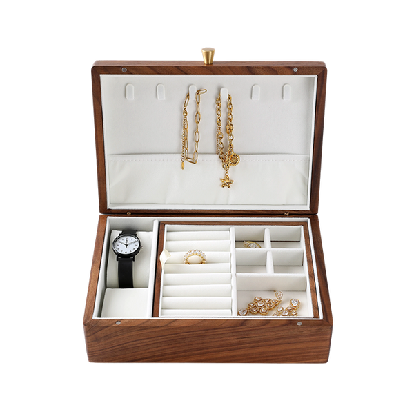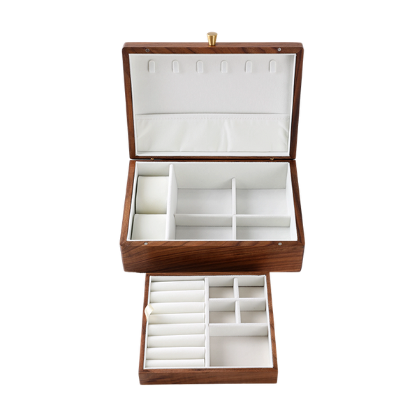 Elegant jewellery box made from rich black walnut wood, featuring a practical lift-out tray for organised storage. Measuring 25 x 18 x 8.8cm, it’s ideal for keeping rings, earrings, and other small accessories neatly arranged, while adding a touch of natural sophistication to your décor.