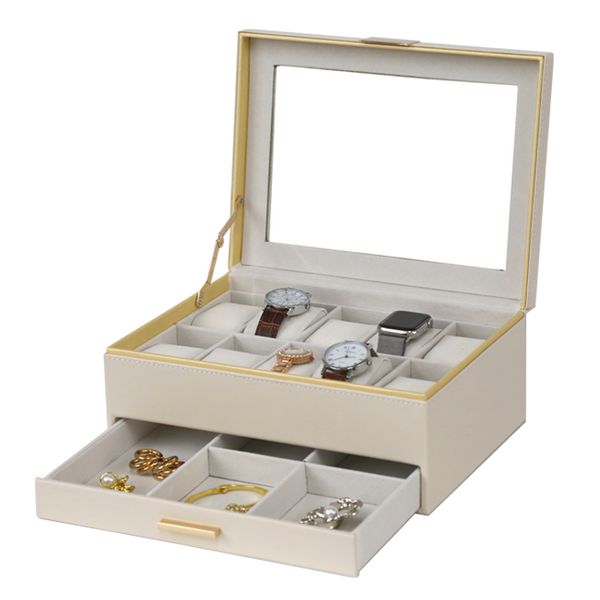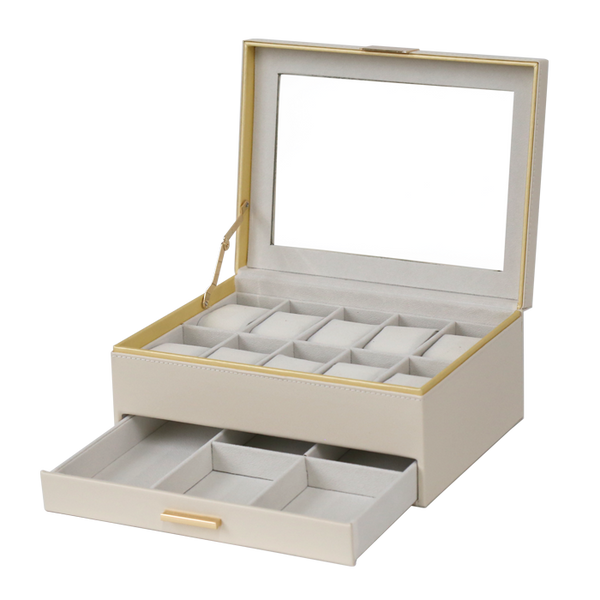 Elegant jewellery box crafted from luxurious champagne-coloured PVC leather, featuring a single spacious drawer for organised storage. Measuring 28.2 x 21.3 x 12.3 cm, it’s perfect for keeping necklaces, bracelets, rings, and other treasured pieces neatly arranged, while adding a sophisticated touch to your dressing table.
