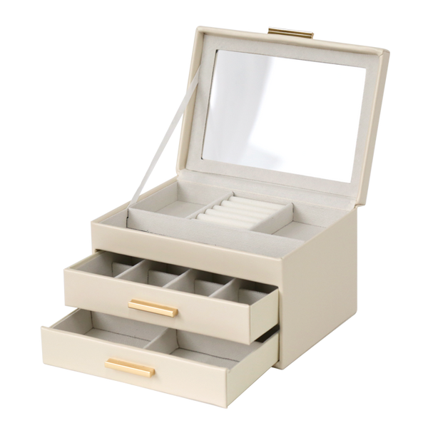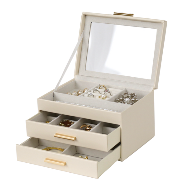 Stylish jewellery box wrapped in champagne-coloured PVC leather, featuring two smooth-opening drawers for organised storage. Measuring 21 x 15 x 13 cm, it’s ideal for keeping rings, necklaces, bracelets, and other treasures neatly arranged, while adding a touch of elegance to your space.