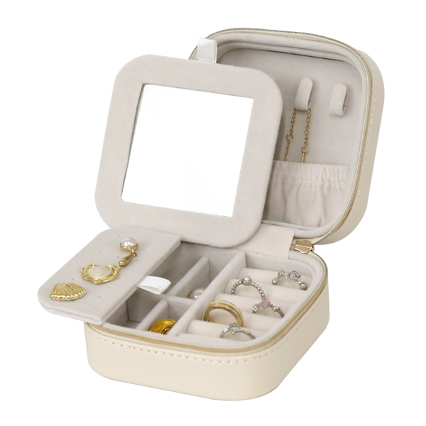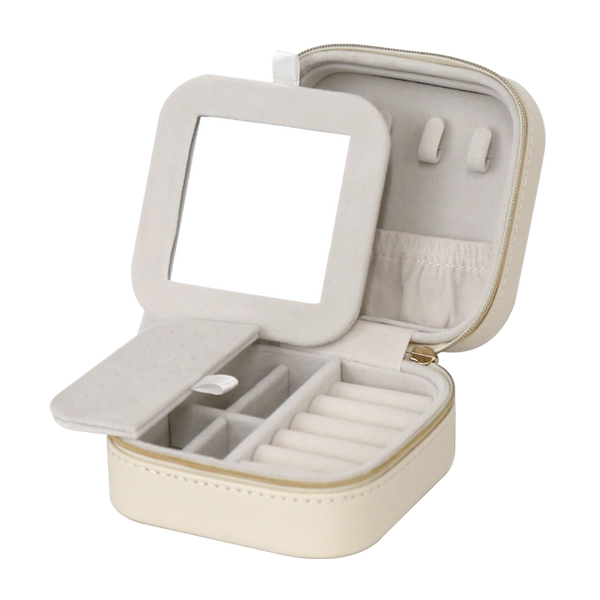Compact travel jewellery box in champagne-coloured wrinkled PVC leather, designed for elegance and portability. Measuring 10.5 x 10.5 x 5.6 cm, it’s perfect for keeping rings, earrings, and small accessories safe and organised while on the go.