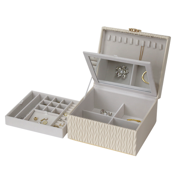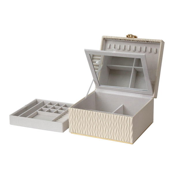 Elegant jewellery box in champagne-coloured wrinkled PVC leather, featuring a practical lift-out tray for organised storage. Measuring 24 x 21.5 x 13.5 cm, it’s ideal for keeping rings, earrings, bracelets, and necklaces neatly arranged, while adding a touch of sophistication to your décor.
