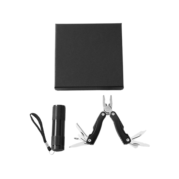 Practical gift set featuring a versatile pair of pliers and a compact torch, neatly presented in a sleek black box. Ideal for everyday tasks, DIY projects, or keeping on hand for emergencies.