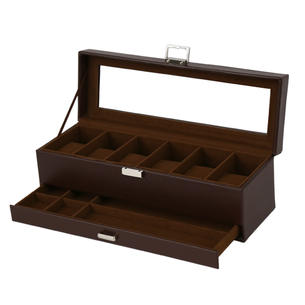 Sophisticated watch box wrapped in rich brown PVC leather, designed to hold up to six watches securely and a draw. Measuring 33 x 11 x 11 cm, it offers a stylish and organised way to protect and display your timepieces, making it a perfect addition to any collection.